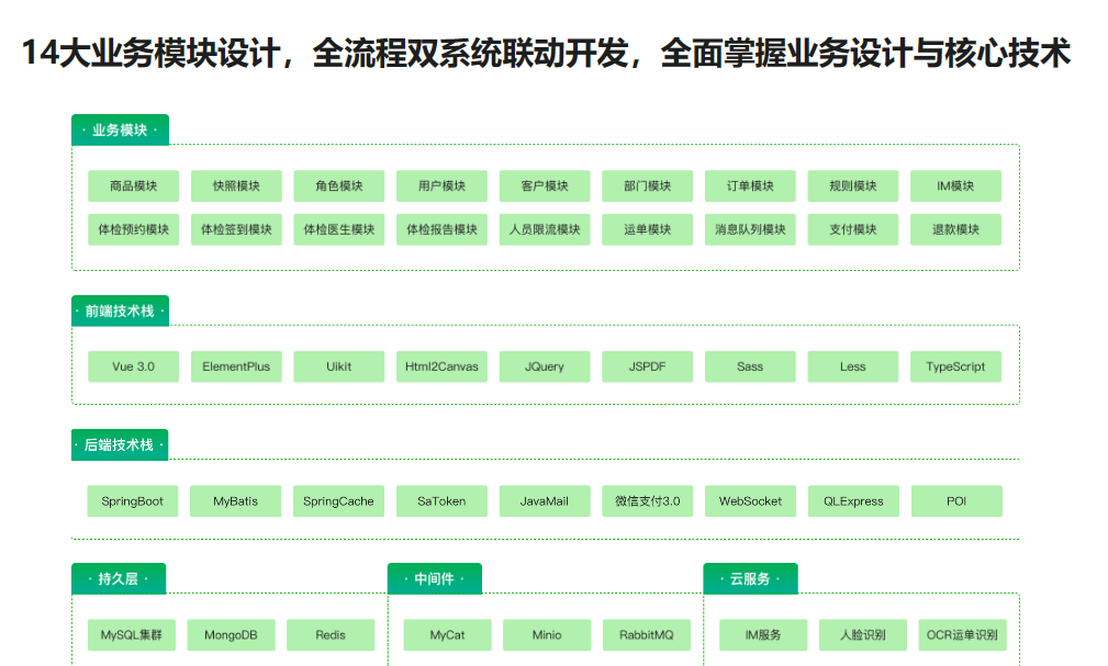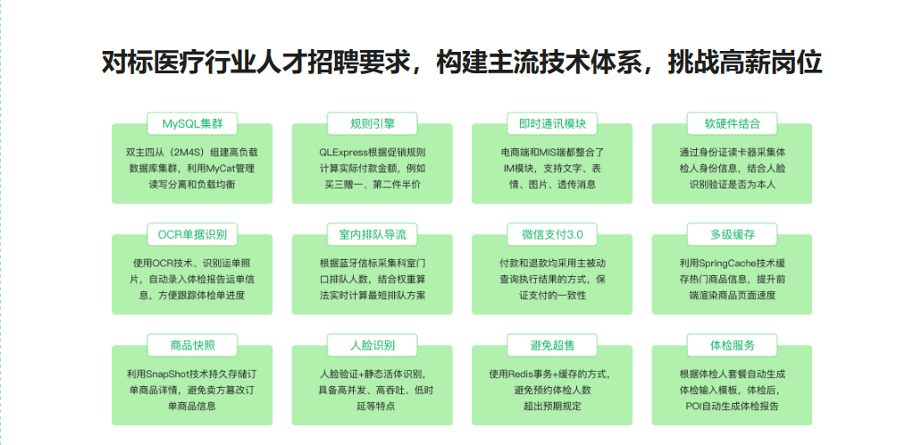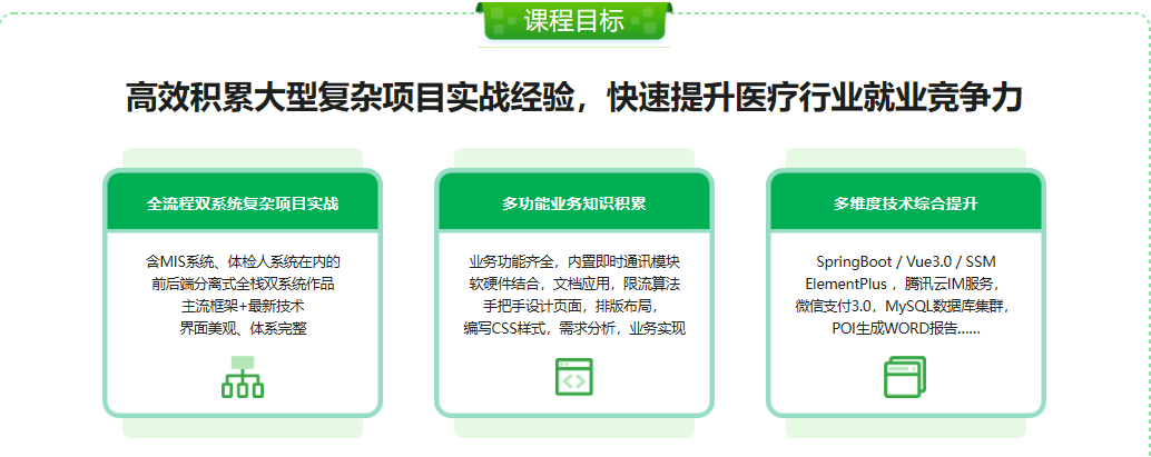 医疗行业是互联网发展前景极好的领域之一,对于初入职者、转行者来说都是很好的选择。课程以业务驱动技术栈,打造完整、全面的双系统项目,并采用前后端分离架构,业务功能完善(健康体检与健康管理两大业务),界面美观,可以高效积累大型医疗项目经验,快速提升医疗行业就业竞争力。