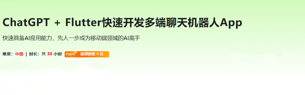 当前ChatGPT应用如雨后春笋般应运而生,给移动端开发者也带来了极大的机会。本课程将整合ChatGPT与Flutter高级技术,手把手带你从0到1开发一款可运行在多端的聊天机器人App,帮助你抓住机遇,快速具备AI运用能力,成为移动端领域的AI高手。