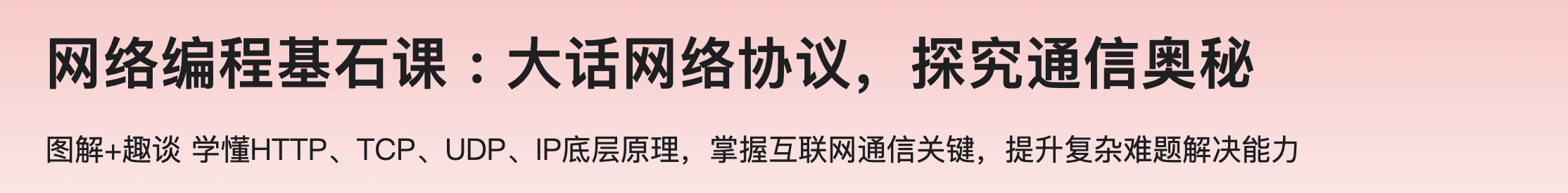 网络编程基石课 大话网络协议,探究通信奥秘视频教程。很多程序员在提升编程水平时遇到瓶颈,主要原因是网络编程基础不够扎实。精通网络协议是加速提升网络编程能力的关键。我们的课程通过图解和趣味讲解,打破了传统枯燥的学习模式,轻松让你掌握TCP、UDP、IP、HTTP等核心协议的工作原理和应用场景。这将帮助你全面理解网络通信的精髓,加速提升编程水平。