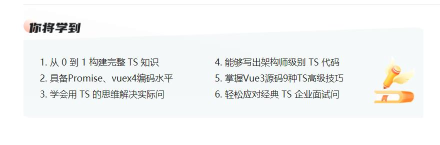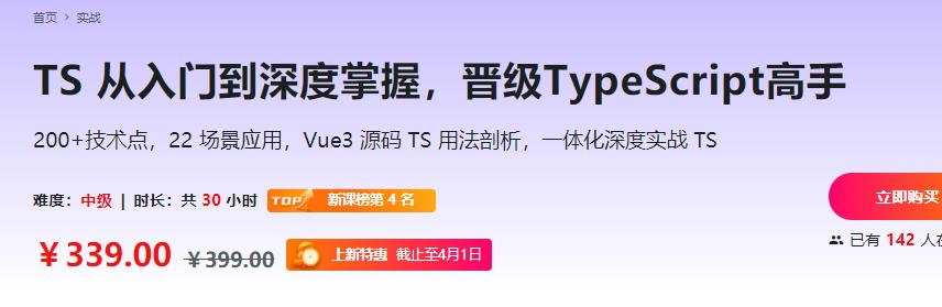 - TypeScript 已经成为前端未来必备技术,无论你是想入门 TS,还是精通 TS,本课程都可以满足你的需求。这门课程,将用保姆级的讲法带你从 0 基础系统构建 TS 知识体系,同时手把手带你编写 vuex4 及 Promise 真实源码项目,综合提升你的 TS 实战能力,最后再剖析 Vue3 源码当中 TS 的高级用法,让你真吃透 TS,成为 TS 高手。
