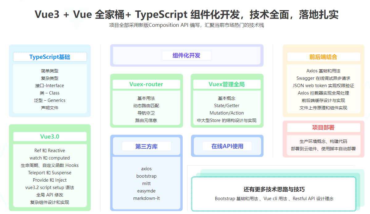 Vue3 +TS ,使用新版Vuex 和 Vue-Router 全家桶让你学会一个基本的组件库的开发思路和技巧。接入真实后端API,提供抓住前后端分离开发痛点 – 权限管理,路由控制,全局Store 结构设计,前端缓存实现等。