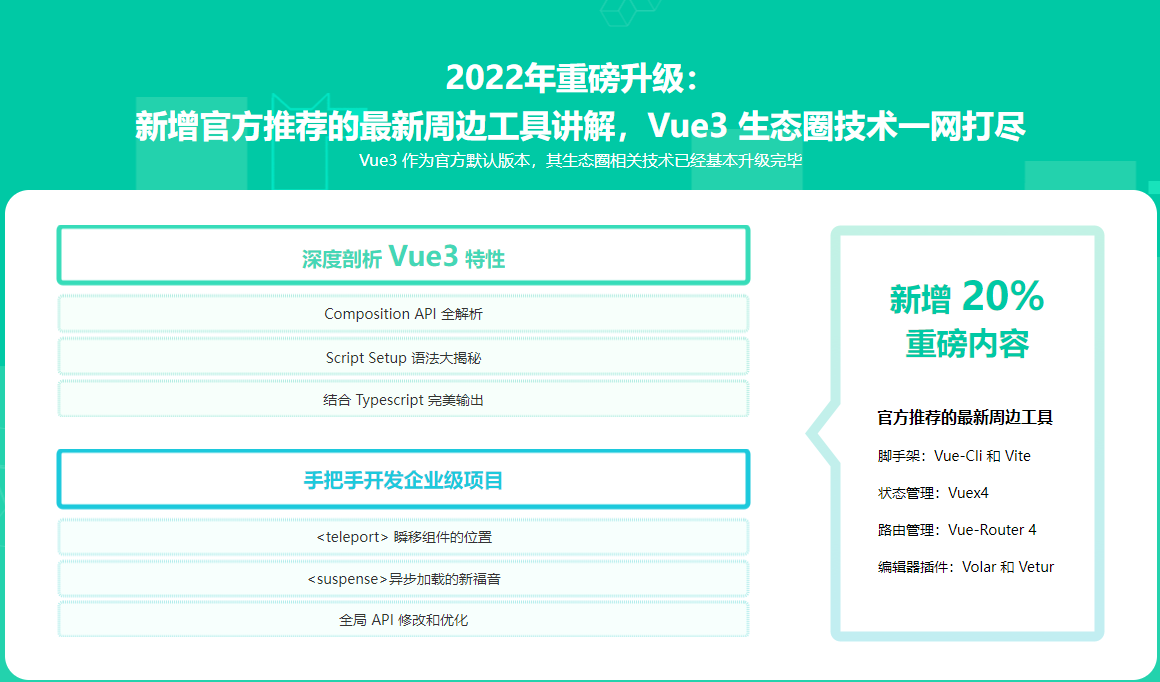 首先浏览 vue3 新带来的变化,然后从为什么会有 vue3 引出话题, 带领大家学习 compostion API,自定义Hooks,Teleport,Suspense 和 全局 API 修改等一系列 vue3 的重大更新。
