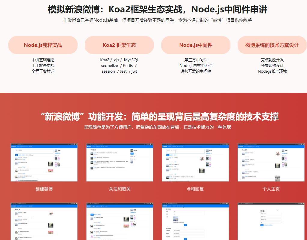 课程从零模拟开发一个基本功能完备的微博系统,完成整个Koa2框架生态的综合技术实战,包括各类中间件,MySQL数据库设计,微博项目架构等诸多干货内容,最后带你从技术层面总结 Node.js 实践经验