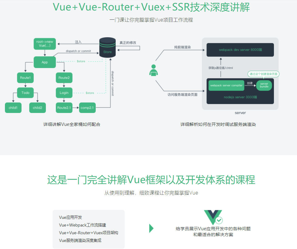 这是一门重技能解说的课程,通过一个Todo使用深化解说Vue使用开发,Vue+Webpack工作流建立,Vue+Vue-Router+Vuex项目架构和Vue服务端渲染深度集成,以此给学员展现Vue使用开发中的各种问题和优质解决方案。